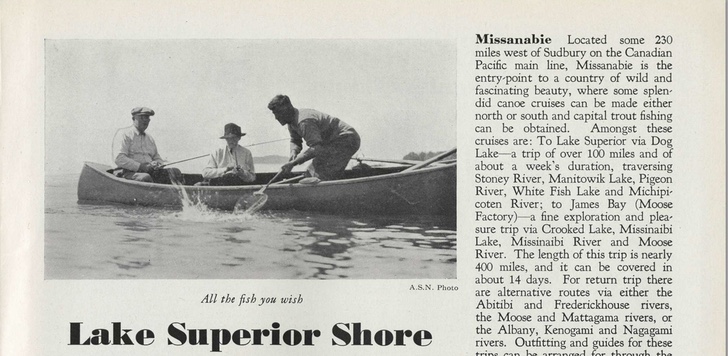 A real he-man’s canoe cruise of marvellous possibilities is that via Dog Lake, Missinabie Lake, Whitefish Lake and Michipicoten River, to Lake Superior, coming out at the Algoma Central Railway. At Missinabie, on the Canadian Pacific, you detrain virtually on the shore of Dog Lake. And the man who demands excitement with his sport is in for a 58-mile feast of sparkling fishing— both speckled and lake trout running to generous size and quantity. There is only one difficult portage— the rest being comparatively east. But the guides at Missinabie simplify such matters just as expertly as the Hudson’s Bay Co. and Jules F. Ross settle your outfitting problems. (p. 40).