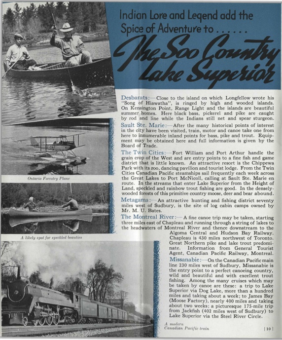 The Algoma region was developed slowly compared to other more accessible Ontario tourist destinations like Lake of the Woods, Temagami, the French River, and Muskoka— in these places, CPR and private owners constructed luxury motels and “bungalow camps” for urban tourists. I found a number of CPR brochures that outline attractions across Ontario in the early decades of the 1900s; in each there are pages upon pages describing the conveniences and activities of popular camps, and about one paragraph advertising canoe trips out of Missanabie.
