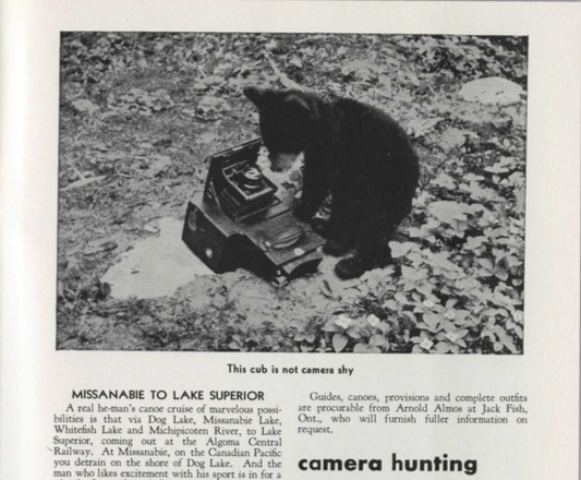 The 1939 guide includes the same copy for the Missanabie and Oba trips (p. 45). Along with fishing and hunting, CPR endorses photography tours and tips for the wilderness adventurers (p. 37), reaching out to other types of tourists besides the sportsperson. At this point, the Chapleau Crown Game Preserve had already been established.